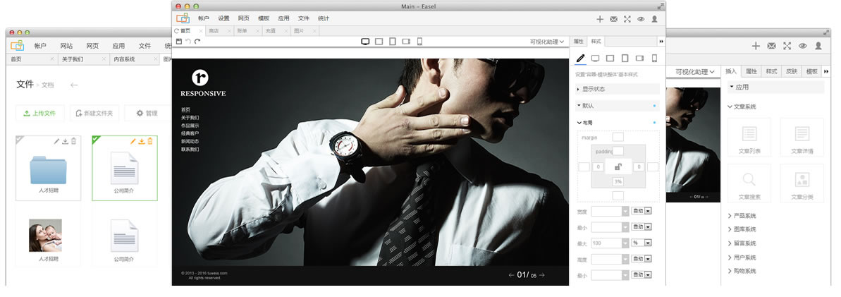 全球领先的响应式网站自助建设平台拥有十年以上经验的开发团队,运用最先进的HTML5技术,完全自主研发出全球领先的响应式网站自助建设平台。用户在突唯阿快速创建响应式网站,一站打通电脑、手机、平板、百度、微博、微信。无需设计和编码知识,自己就能方便的修改排版、样式、内容和功能,根据促销和活动需求,即时添加网页和栏目。